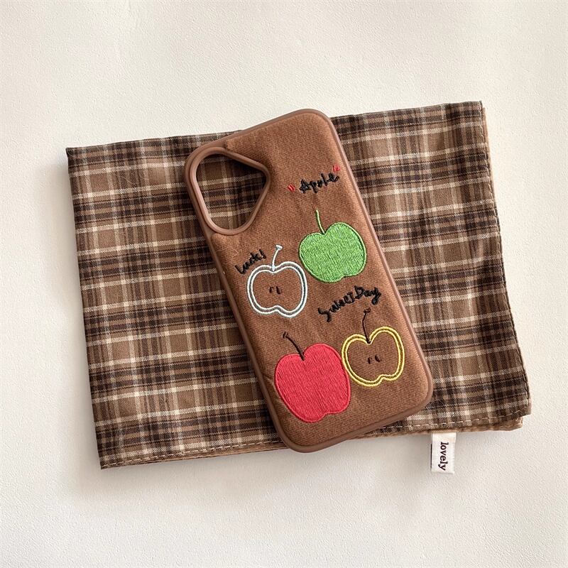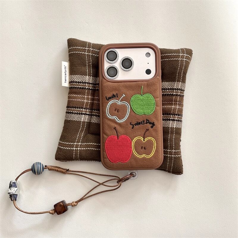 レザー調のブラウンに、カラフルなリンゴ刺繍をあしらったナチュラルテイストのiPhoneケース。
