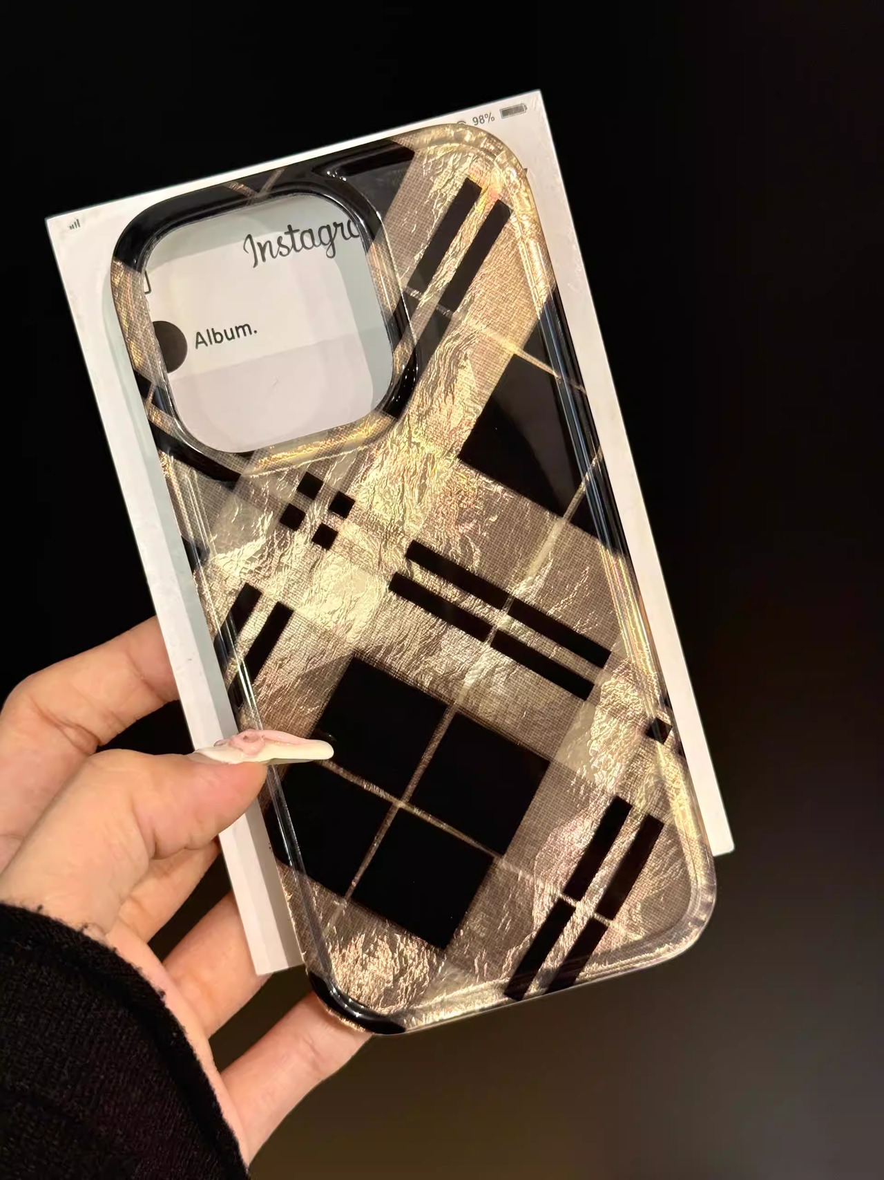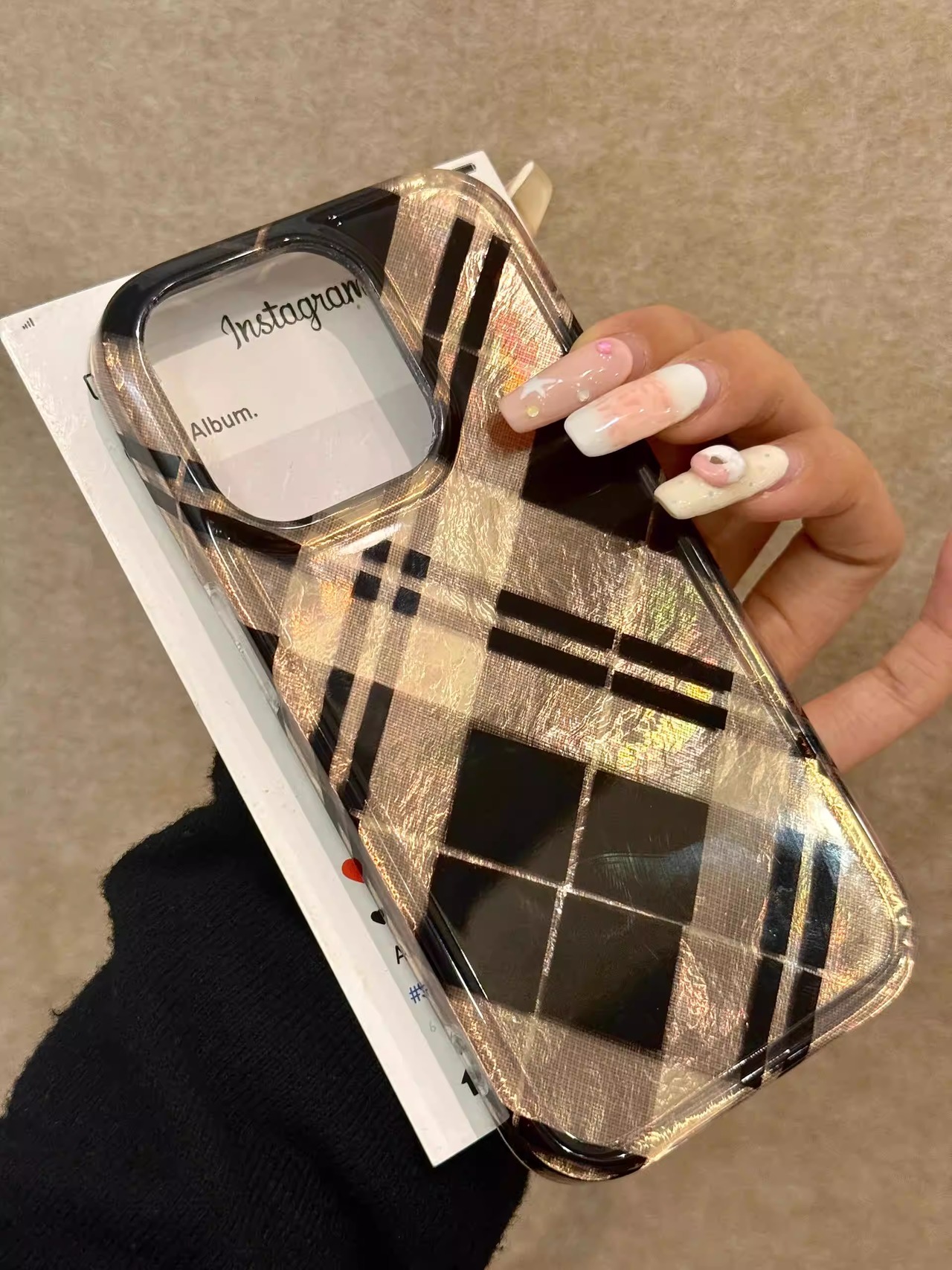シンプルなのに目を引く、ベージュ×ゴールドのチェックデザインがおしゃれな iPhone ケースです。