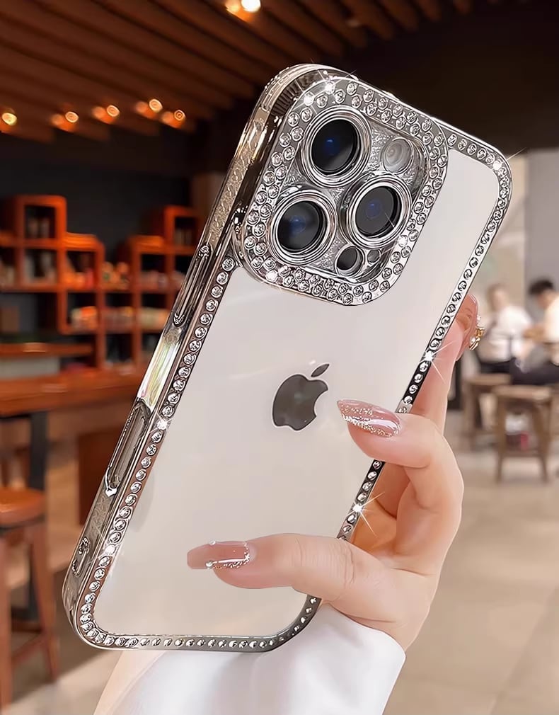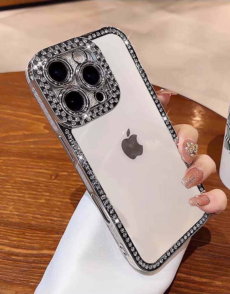 洗練されたクリアボディに、フレームとカメラ周りを贅沢に彩るラインストーンが輝くラグジュアリーiPhoneケース。