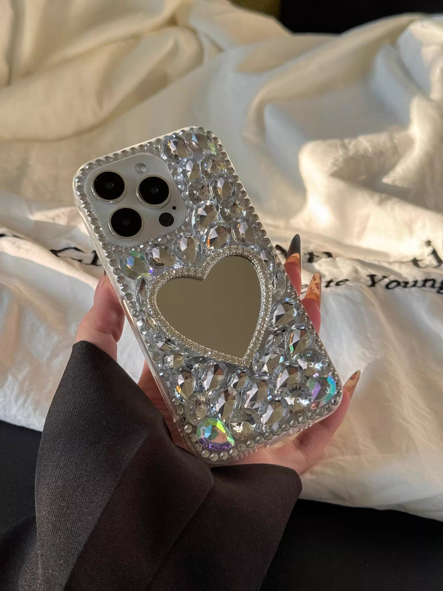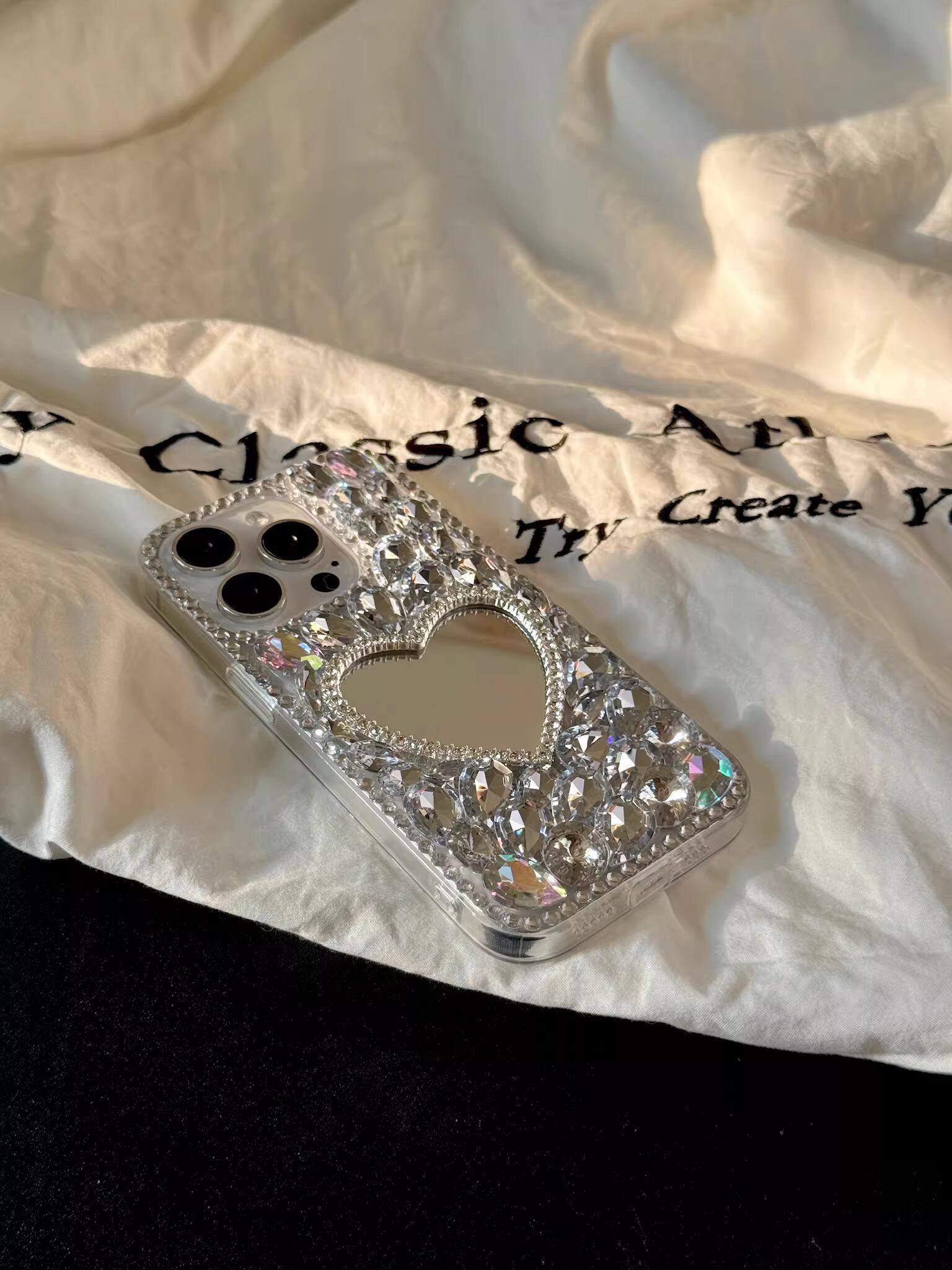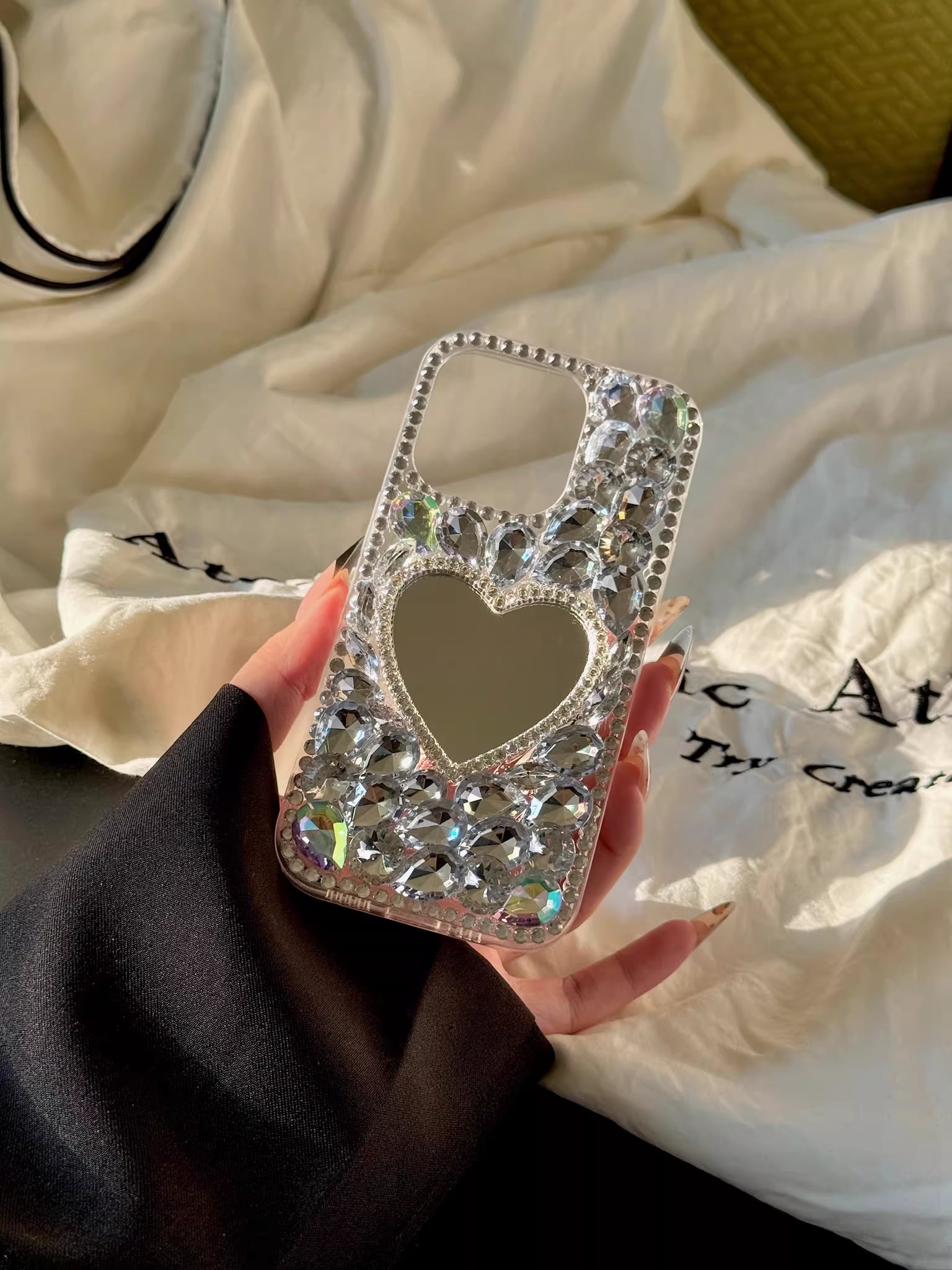 圧倒的な存在感と輝きを放つ、ハート型ミラー×全面ビジュー装飾のラグジュアリーiPhoneケース。