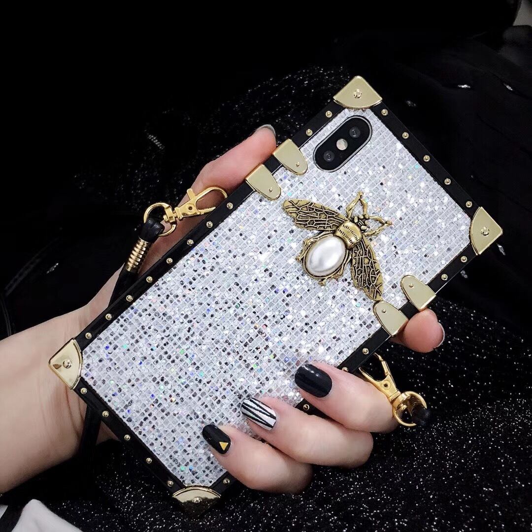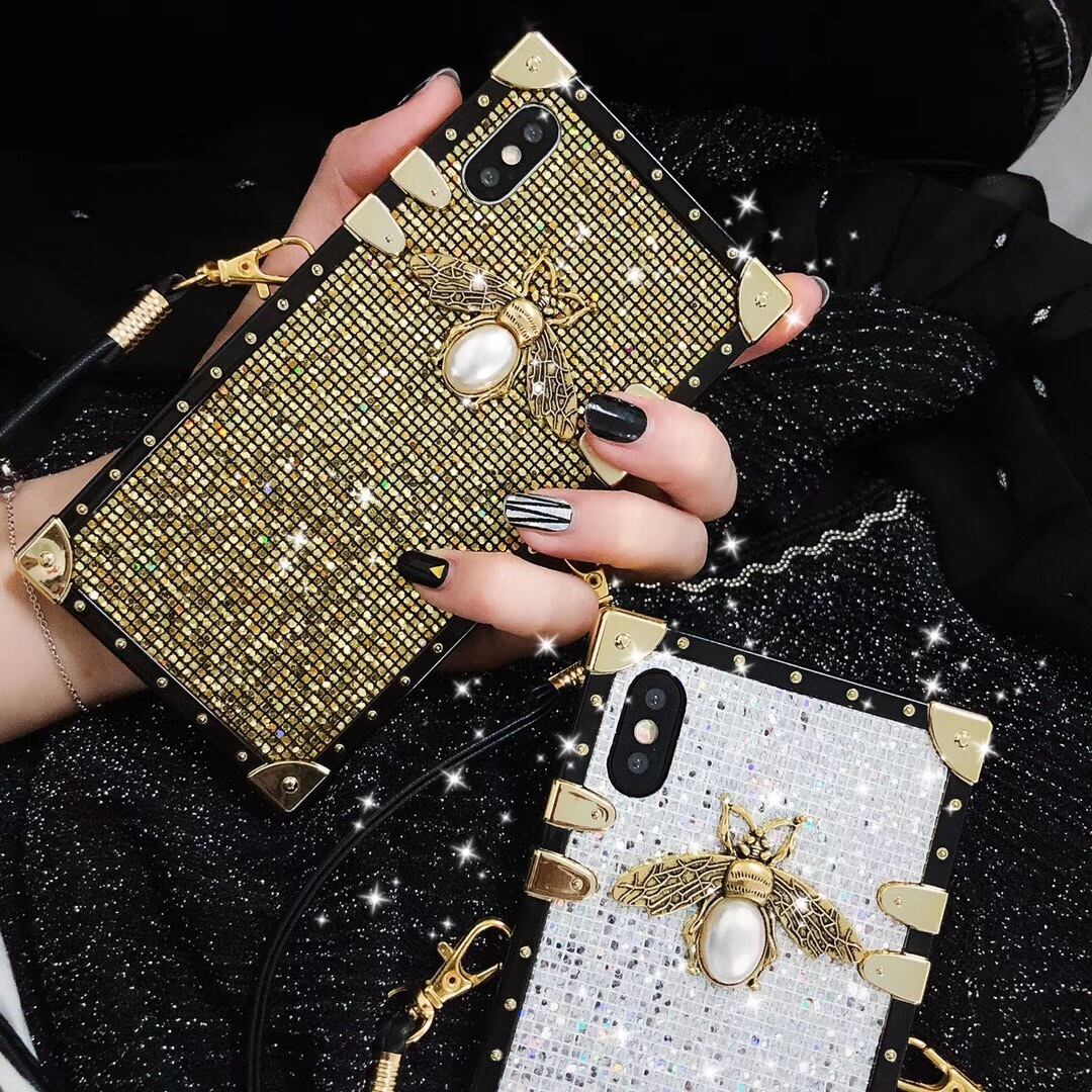 新着✩iPhoneXS XR XSmax 8 8plus 7 7plus 6s 6splusケース レザーストラップ付き 蜂 贅沢 ビジュー 日本未発売♥レディースにオススメ♪
