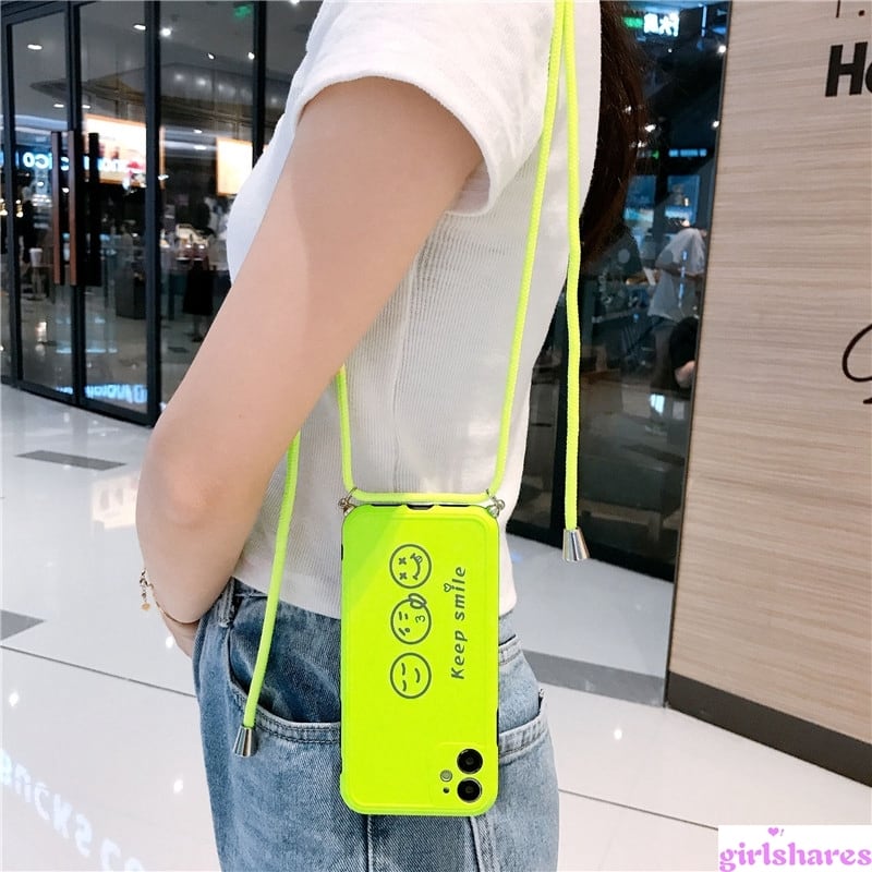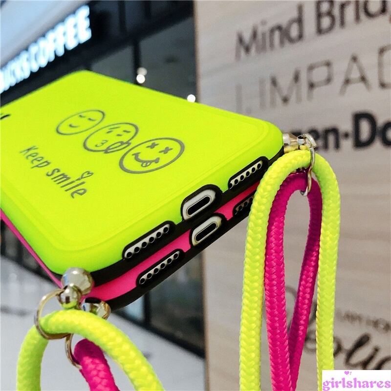 「ネオンカラー」 斜め掛け iPhoneケース ショルダー付き スマホケース Keep Smile 笑顔 表情 かわいい 目立つ アイフォン 12ProMax 12Pro 12 12Mini 11ProMax 11Pro 11 XSMAX XS XR SE2 8 8Plus 7 7Plusカバー ソフト かわいい 大人 オシャレ 2colors♪