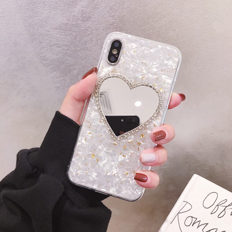iPhone13ケース ハート鏡付き 貝殻柄 アイフォン13Pro 13ProMax 12Pro 12 11ProMax XS XR 7Plusカバー 可愛い スマホケース 金箔入り 銀箔入り 2色 スタイリッシュ エレガント
