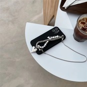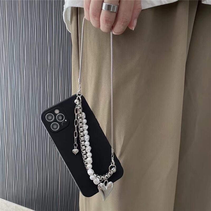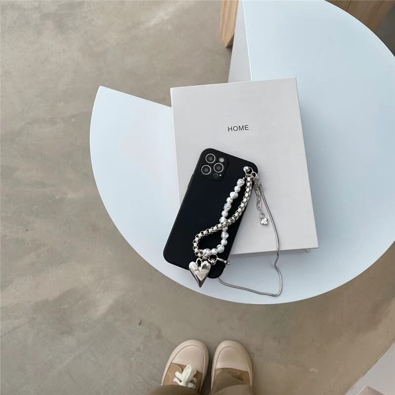 iPhone13 13Pro 13ProMaxケース パールチェーン付き iPhone12ProMaxケース ハート アイフォン 11 XS XR SE2 8 7Plusカバー 大人可愛い ブラック お洒落 トレンド 大人気