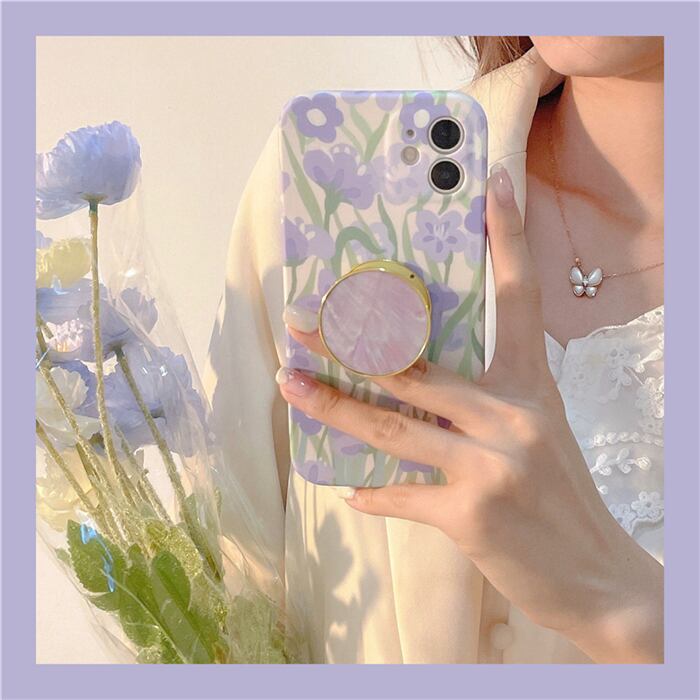 ポップソケッツ付き iPhone13ProMax・12・11Pro・XR・8Plus・7ケース 花柄 エレガント 可愛い パープル系 女子 スタイリッシュ 新品♪