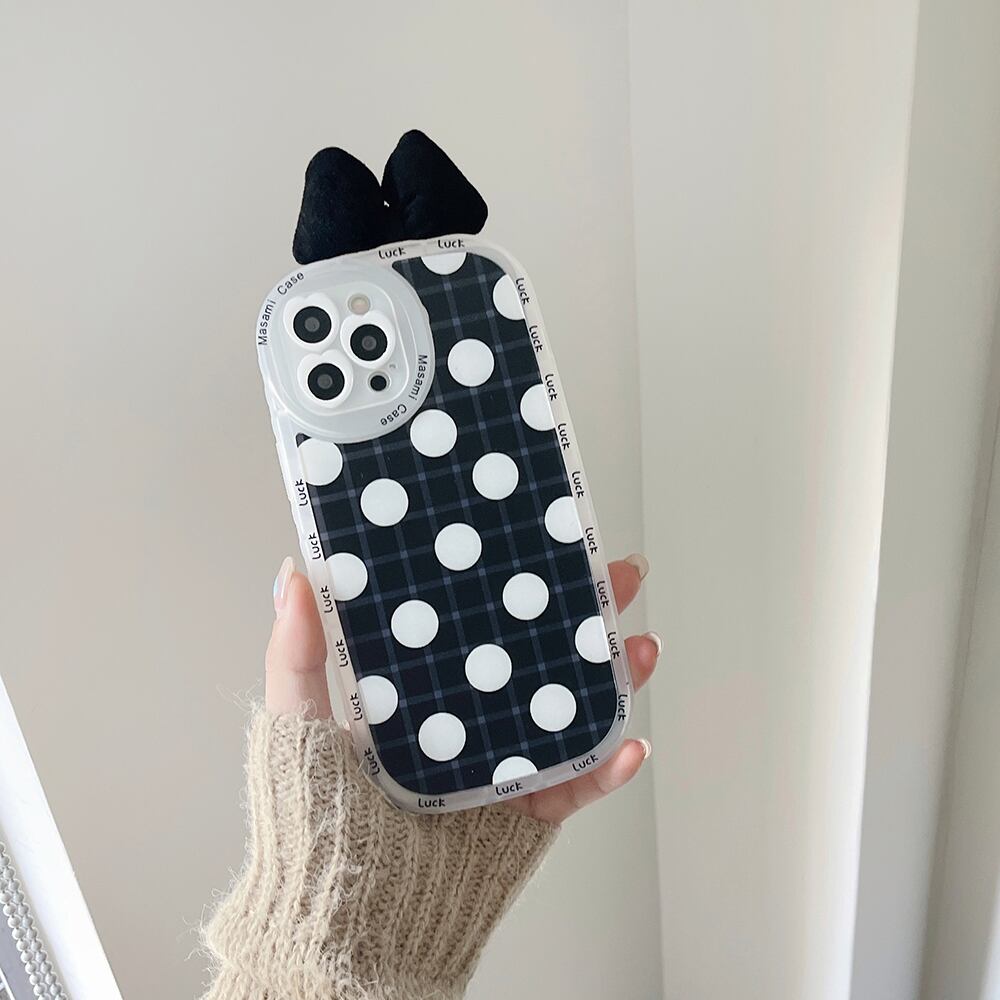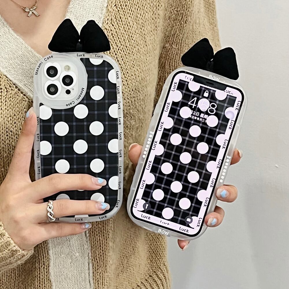 iPhone13 Pro/12/11 ProMaxケース ドット柄 大人可愛い アイフォン13proカバー リボン付き レディース 水玉模様 ポルカドット ブラック 税込