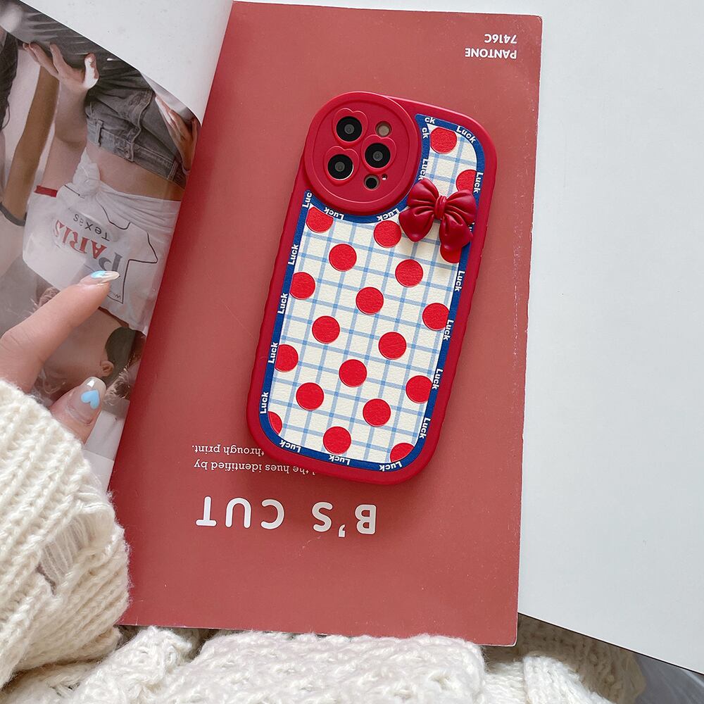 ポルカドット iPhone13 Proケース リボン付き 大人可愛い アイフォン13ProMax 12Pro 11 XS 8Plusカバー ドット柄 水玉模様 お洒落 レッド 韓国ファッション